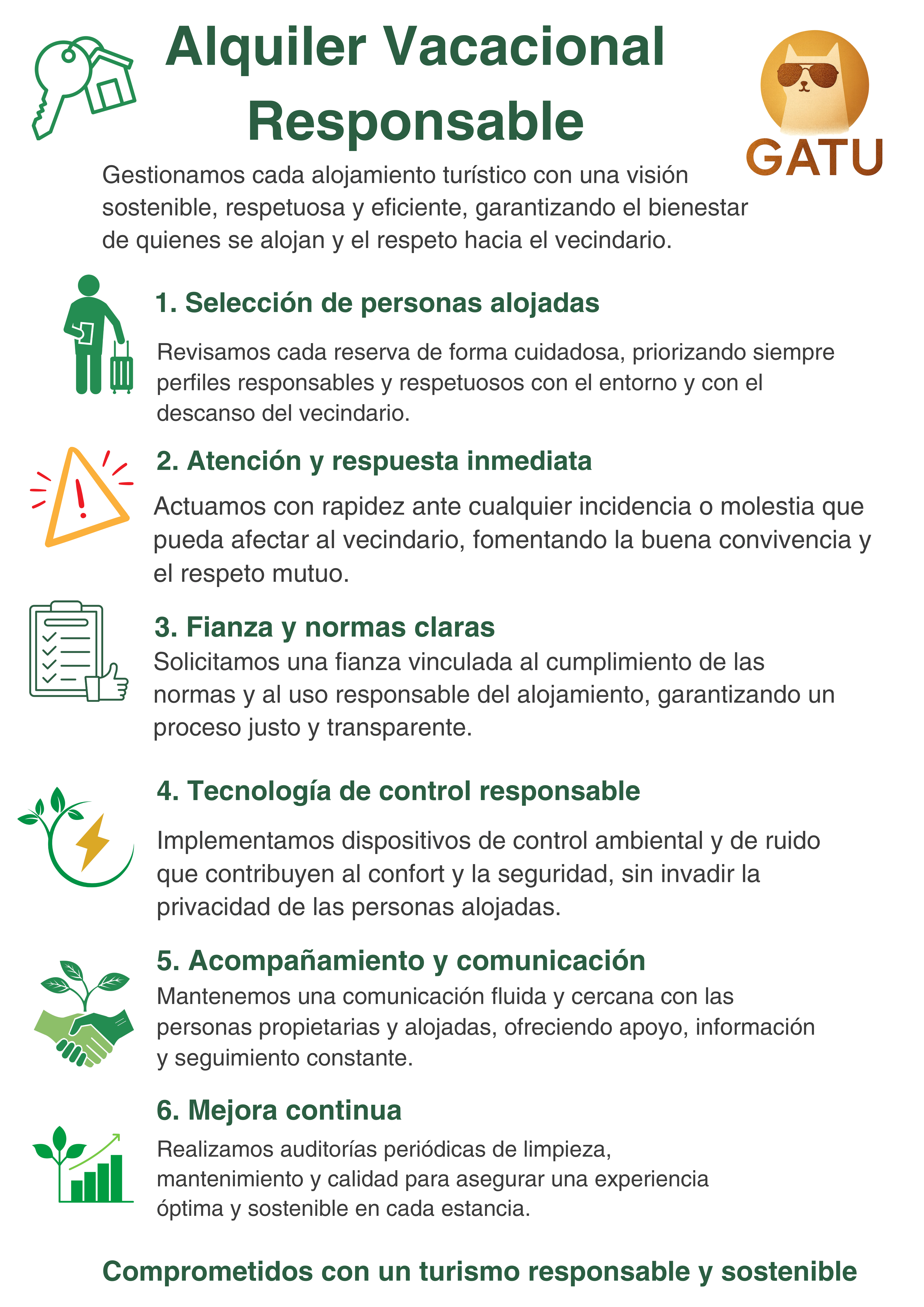 Somos la única agencia de alquiler vacacional RESPONSABLE , con conciencia de los inconvenientes, que a veces pueden causar algunos huéspedes, comprometidos con el medio ambiente, la sostenibilidad y el respeto.