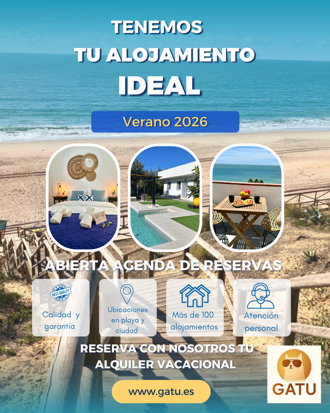 GATU Somos una empresa de alquiler de viviendas de uso vacacional en la zona de la Bahía de Cádiz, especializada en la calidad de los pequeños detalles, el trato personal y la atención al cliente como prioridad fundamental.